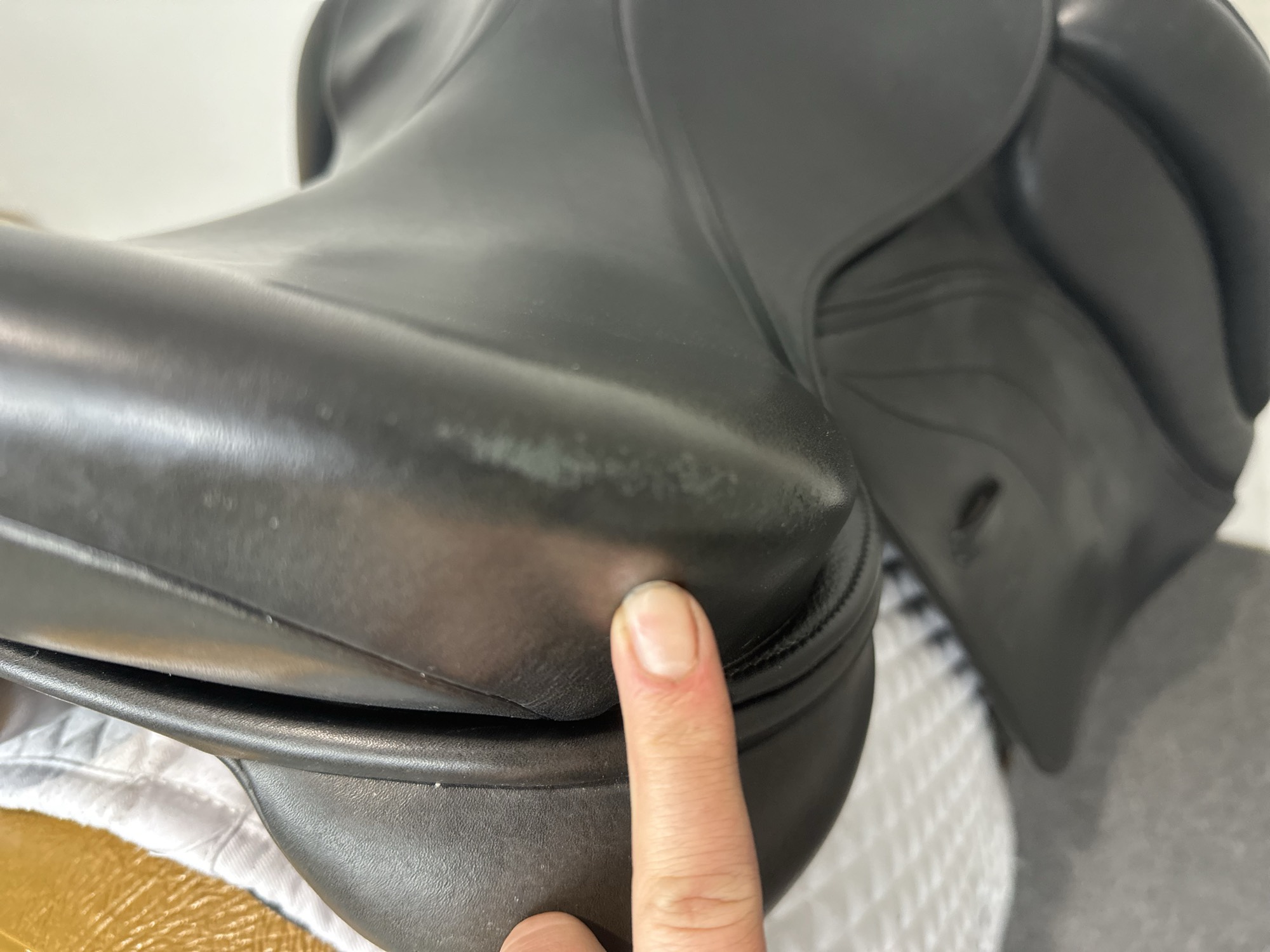 It is normal, especially if the surface of the leather is ‘damp‘, to experience some colour loss onto your breeches.
